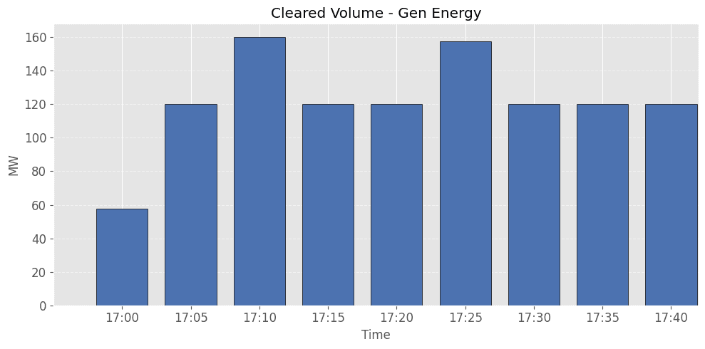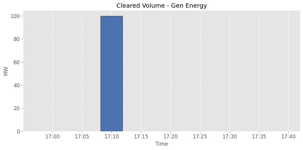 One example strategy is to bid into price band 10 (at the price cap) when the participant does not plan to discharge. In the example below, the battery fails to clear during several high-price intervals because the forecast did not anticipate the spikes. As a result, under this default bidding approach, the asset is not awarded any MW for the Gen Energy products when the price spikes but does not reach the price cap.