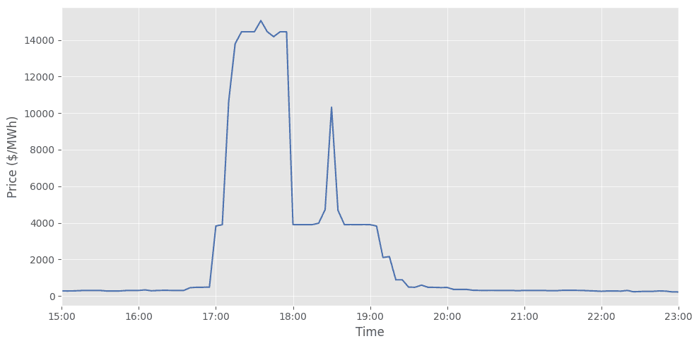 Spot prices for each market product clear every 5 minutes and are bounded by the Market Price Floor (MPF: –A$1,000/MWh), the Market Price Cap (MPC, set annually by the AEMC, currently A$20,300/MWh for FY26), and (on occasion) an Administered Price Cap applies during sustained high-price events.